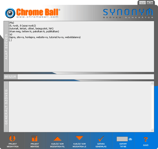 A program használata szerintem pofonegyszerű, mindenkinek menni fog. Az alap elgondolás az (és ez a későbbieknél is így lesz), hogy a szövegben egyes részeket, részleteket szinonimákkal lehet helyettesíteni. Az, hogy ezek a szinonimák mik legyenek, nekünk kell meghatároznunk.
