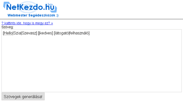 A NetKezdő Szöveg Generátor elérhetősége: http://tools.netkezdo.hu/szoveg-generator/
