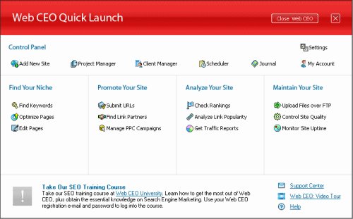 Ingyenesen elérhető (letölthető) keresőoptimalizáló szoftver, melynek van egy bővebb, fizetős verziója is. A WEB CEO segítségével nyomon követheted a honlapod helyezését a keresőkben, illetve sok egyéb dolgot is képes vizsgálni egy gombnyomásra: