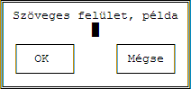 Mielőtt tovább megyünk, nézzük meg egy grafikus felület működését. Az itt leírtak természetesen nagyon messze állnak a valóságtól, ezeket a feladatokat az operációs rendszer (az ablakkezelő) látja el, viszont fontos még az elején kiemelni. Egy egyszerű példát vegyünk, „GUI”-nk alapjául: egy 28 * 7 karakteres terminál már elég hozzá. Az l alatt levő karakter jelölje a kurzort. (Valójában ez egy Text User Interface (Tui), viszont működése emlékeztet a GUI-kéhoz: a WIMP-ből (Windows, Icons, Menus, Pointers – Ablakok, ikonok, menük, mutató eszközök) az ablakot, a menüt és a pointert magában foglalja)