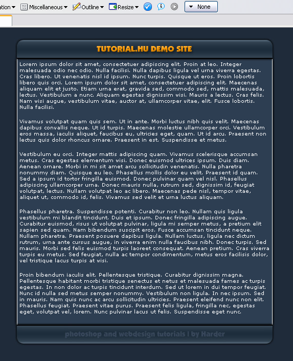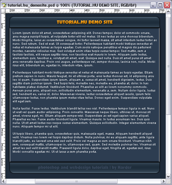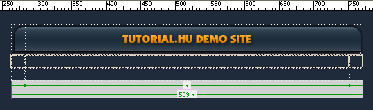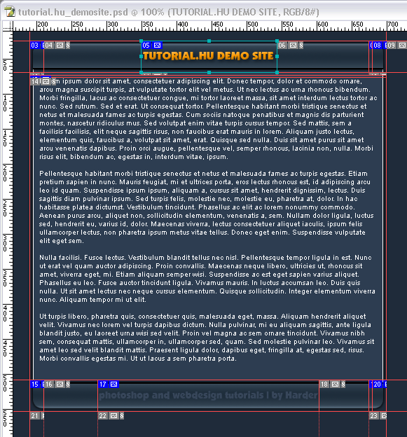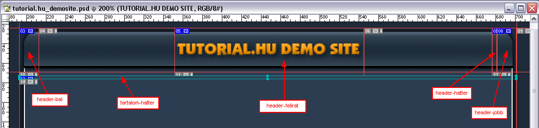 - a header részen van egy bal oldali slice (az ív miatt), a jobb oldalon ugyan hasonló okokból, a jobb oldali mellett egy kis keskenyebb slice ami a header háttere lesz, illetve maga a "tutorial.hu demo site" is egy slice-t alkot.