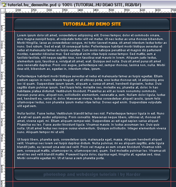 A Photoshop-ban célszerű a grafikát nagyobb egységekre felbontani "guides" (segédvonalak) segítségével. Ezeket a vonalakat úgy tudod létrehozni, hogy az egérmutatóval az ablak bal oldalán és fenti részén látható vonalzóra állsz, majd az egeret nyomva tartva "belehúzod" a segédvonalat a képbe. Ha nem jelenik meg, akkor a "view > show > guides" részen lehet a megjelenését ki-/bekapcsolni. Magát a vonalzót pedig a "view > rulers" (CTRL+R) kapcsolja ki/be.