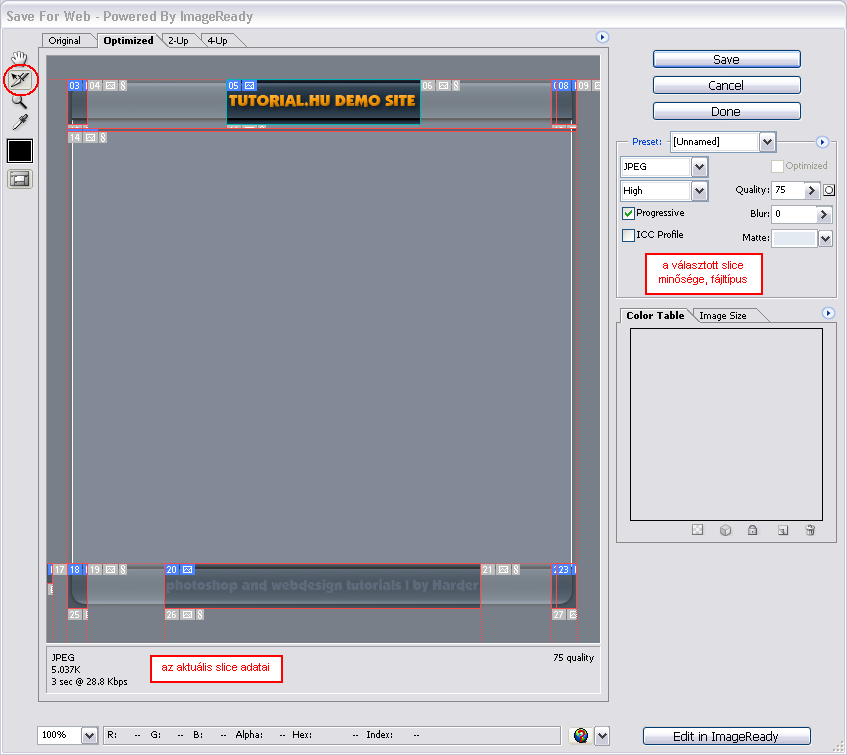 Az ablak bal oldalán látható (és piros körrel jelzett) "slice select tool"-lal tudod kiválasztani, hogy épp melyik szelet legyen az aktuális. Erre azért van szükség, mert minden egyes szelet tulajdonságait egyesével be lehet állítani (minőség, fájltípus stb.). Több szeletet a SHIFT gomb nyomvatartásával tudsz kijelölni.