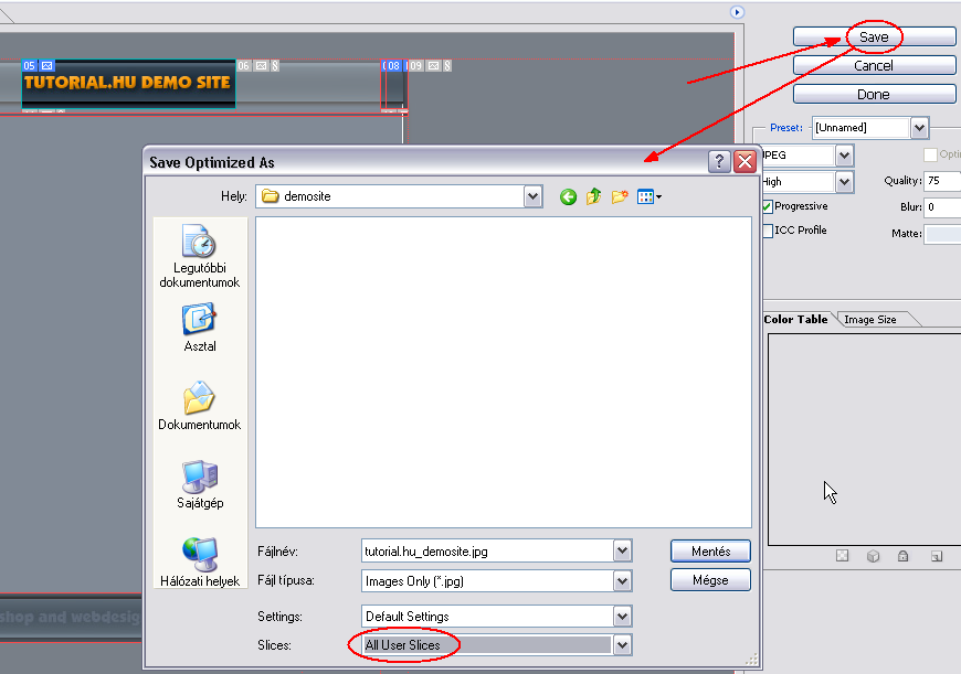 Miután beállítottál mindent, válaszd ki a "Save" gombot, és megjelenő ablakban megadhatod, hogy a képeket hova és hogy mentse el. Elsőre szerintem célszerű "slices"-nál az "all user slices"-t beállítani, így a képből az összes – általad jelölt – slice-t el fogja menteni. A későbbiekben már nyugodtan lehet 1-1 módosításkor csak a változott (és az ablakban kijelölt) slice-t menteni, ehhez ki lehet választani a "selected slices"-t.