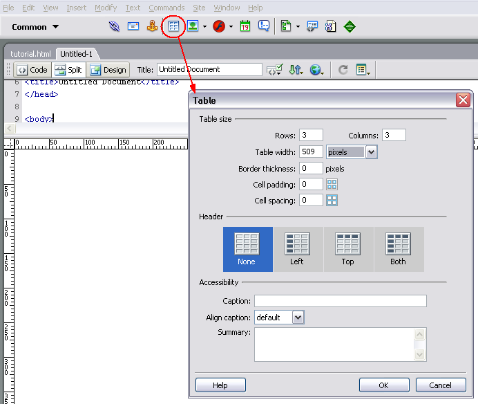 Nyiss egy új HTML lapot a "file > new" (CTRL+N)-ra kattinva. Szúrj be egy táblázatot, mely nálam most 3×3 lett. A 3 sorra azért van szükség, mert van header, tartalom, footer. A 3 oszlopra pedig azért van szükség, mert a kerekített sarkok 1-1 oszlopot elfoglalnak majd, középen meg ugye a ott a felirat, tartalom.