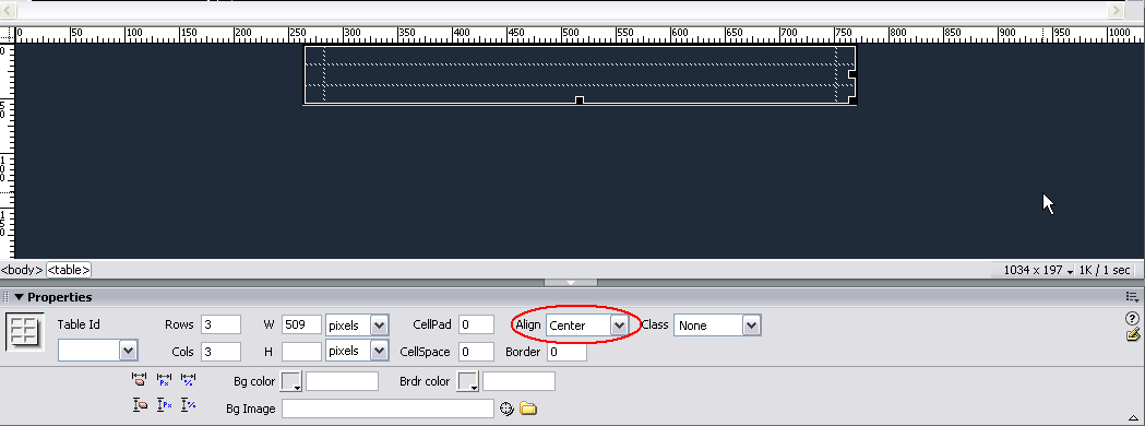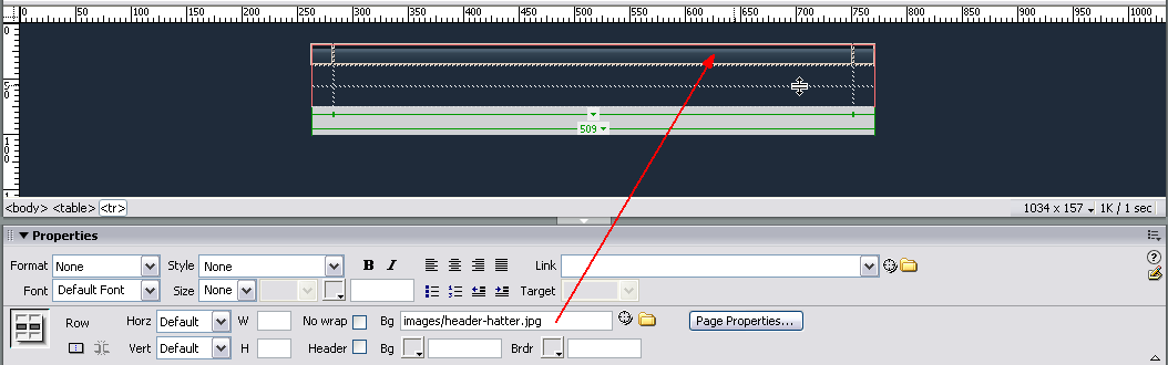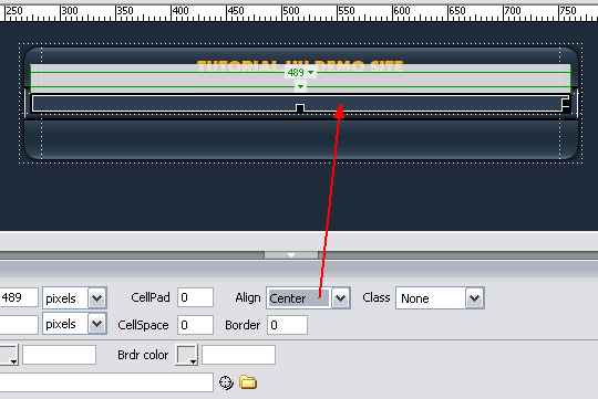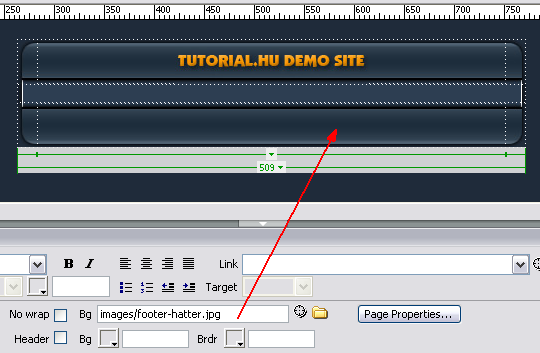 A header sarkainak beillesztése után szúrd be a "header-felirat.jpg" képet is, majd illeszd középre (a cellában állva (és nem a képet kijelölve!) a lenti "properties" ablakban a "Horz" értékét állítsd be "Center"-re. |