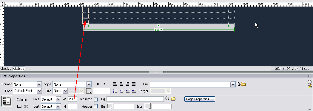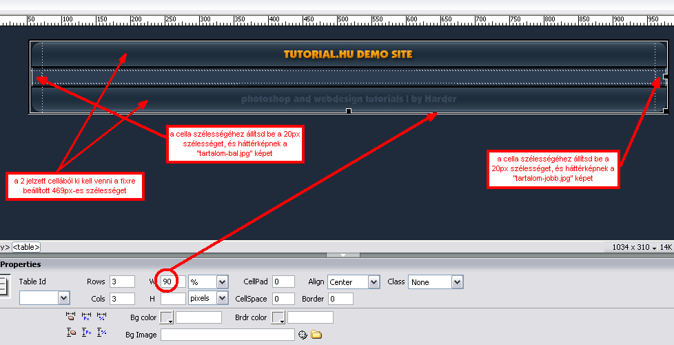 Állítsd be a táblázat celláinak méretét. Ehhez a lenti "properties" ablakban a cellákat kijelölve írd be a "W" (width = szélesség) mellé a "20"-t. A bal és jobb oldali oszlop így most nálam 20px széles lett (ekkorák a lekerekített sarkok képeinek szélessége)