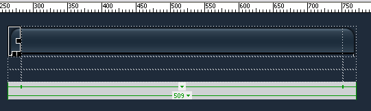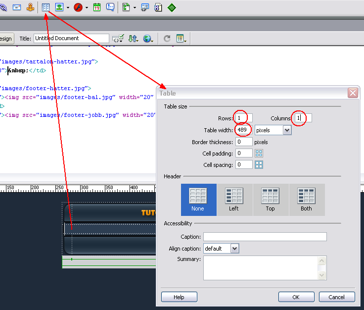 A összeolvasott 2. sorban a háttérkép teljesen "faltól-falig" tart, ha ide bármilyen szöveget beteszel, az rálóg a honlap falára, csúnya lesz. Ezért vhogy távolságot kell tartani a falaktól, amire egyik lehetséges módszer egy újabb táblázat beillesztése (de ez már csak 1×1-es lesz). Mivel azt szeretném elérni, hogy a falaktól 10-10 px távolságot tartson majd a szöveg, így az 509 px szélességből levonok 20 px-t, és beillesztek egy 489px széleset.