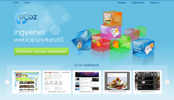 A uCoz egy könnyen kezelhető, dinamikus tartalomra épülő, teljesen ingyenes megoldást kínál mindazoknak, akik villámgyorsan szeretnének egy teljes funkcionalitásában pompázó weblapot, vagy blogot készíteni. A moduláris felépítésnek köszönhetően ebben a rendszerben nem kerül 10 másodpercnél több munkába egy fórumot, képgalériát, vagy éppen egy YouTube videót integrálni a honlap bármely részébe.
