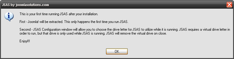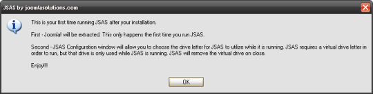 A program először telepíti nekünk a JOOMLA-t (nincs vele külön gondunk), valamint létrehoz magának egy virtuális meghajtót mely csak a JSAS működésekor lesz látható perifériáink között. (alapesetben W: )