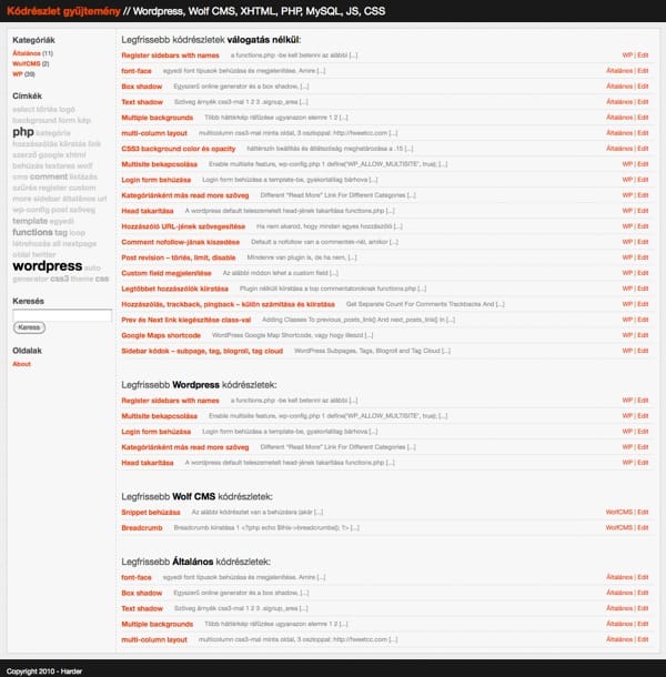 3 nagyobb területre osztottam a kódokat: WordPress, Wolf CMS és Általános. Utóbbiba megy minden olyan kód, mely nem kimondottan CMS-hez tartozik.