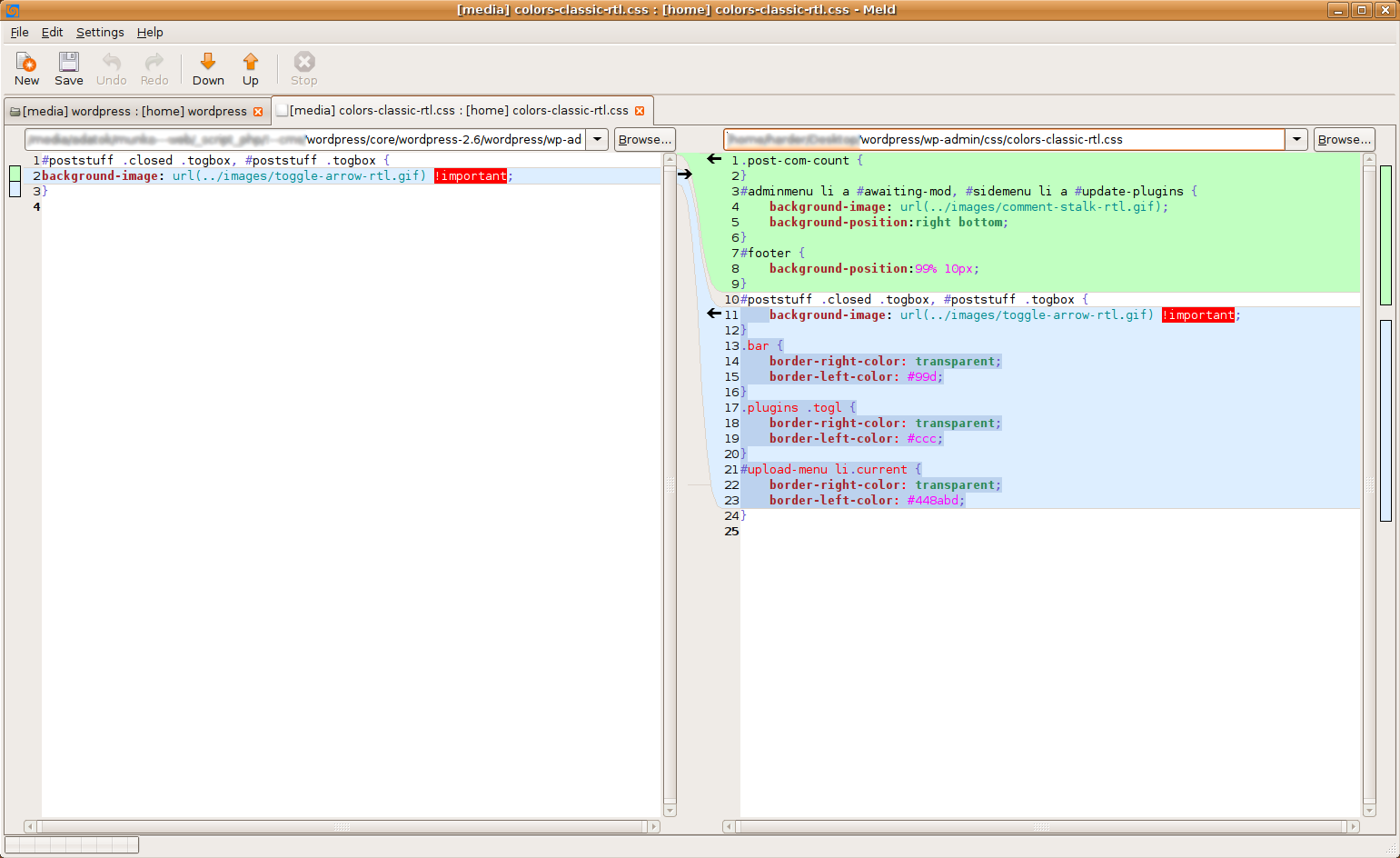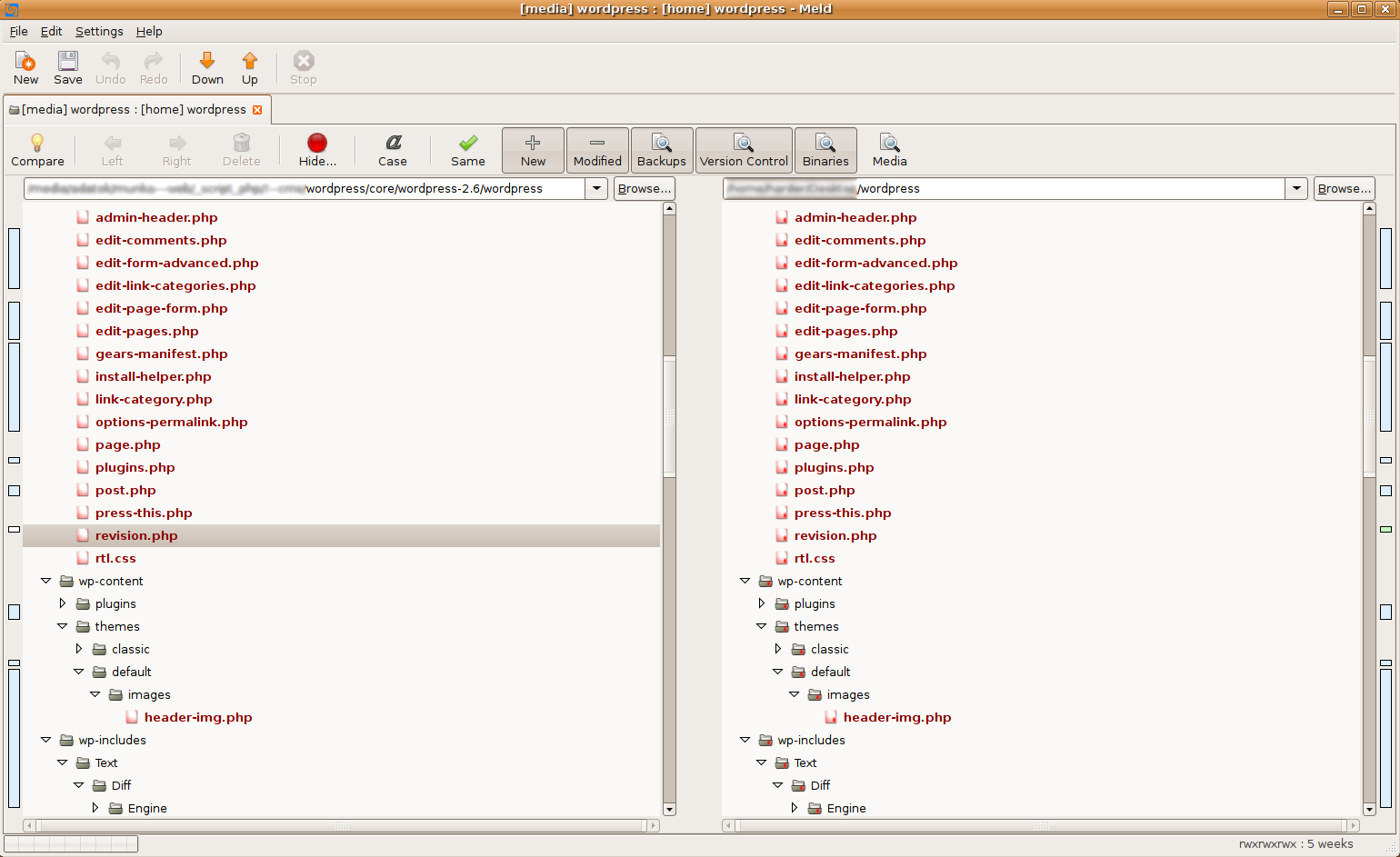 A Meld Diff Viewer persze képes akár könyvtárakat, akár fájlokat is összehasonlítani, ezt a lentebbi képek is jól fogják illusztrálni. A program használatát a WordPress 2.6.1-es verzióján próbáltam ki, mikor is kíváncsi voltam hogy vajon mennyi fájl változott meg (elég sok) és mik voltak ezek a módosítások.