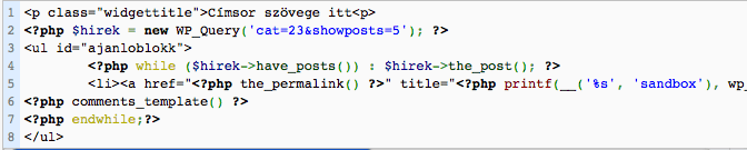 Az alábbi kódrészlettel egy adott kategória X számú elemét lehet listázni pl. sidebar-ba:
