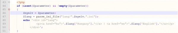 1 2 3 4 5 6 7 8 9 10 11 12 13 14 15 16 | if (isset($_GET['lng']) && !empty($_GET['lng'])) { $nyelv = $_GET['lng']; $lang = parse_ini_file("lang/".$nyelv.".ini"); echo '<div id="lang"> <p><a href="?lng=hu">'.$lang['Hungary'].'</a> | <a href="?lng=en">'.$lang['English'].'</a></p> </div>'; } else { $nyelv = "hu"; $lang = parse_ini_file("lang/".$nyelv.".ini"); echo '<div id="lang"> <p><a href="?lng=hu">'.$lang['Hungary'].'</a> | <a href="?lng=en">'.$lang['English'].'</a></p> </div>'; } |