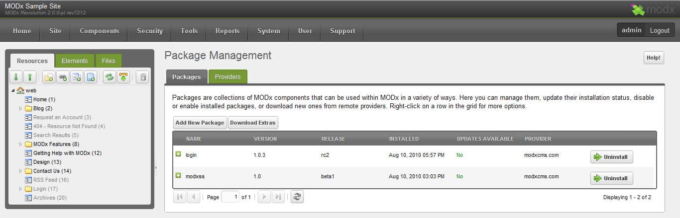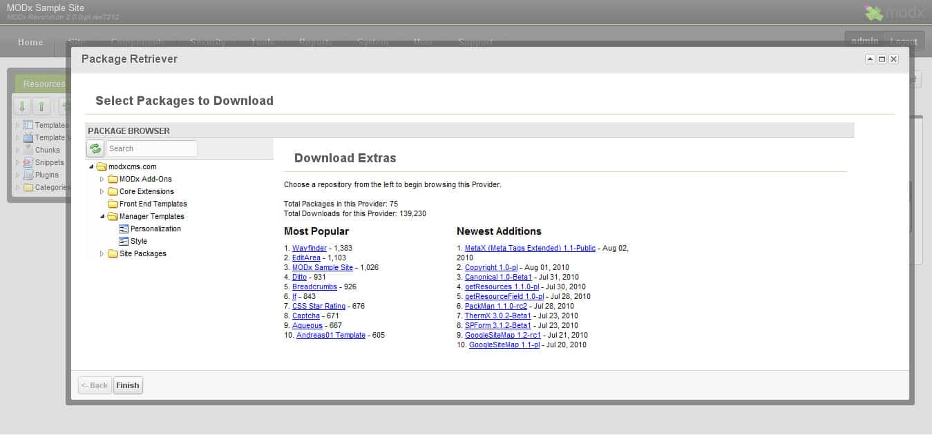 A System/Package Managment menüben érhetjük el a Revolution egyik újdonságát a csomagkezelőt. Mivel még egyetlen extra sincs telepítve, kattintsunk a Download Extras felíratra és keressük meg a MODx Sample Site csomagot, tartalommal együtt felrakja a legfontosabb kiegészítőket is, ha most ránézünk az oldalunkra egyből szebb kép fogad minket és a bal oldali blokk is egyből megtelt tartalommal, menüpontokkal.