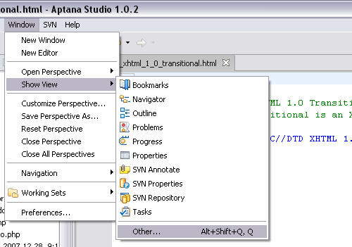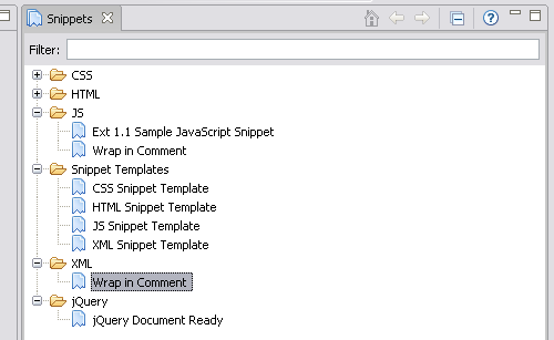 Maga a Snippets könyvtár egyébként a „window/show view/other…” menüpontra kattintva az „Aptana views/snippets” alatt található meg, illetve itt lehet bekapcsolni a nézetet. Bekapcsolás után tetszőleges helyre/oldalra lehet pakolni egyszerűen „fogd és vidd” módszerrel.