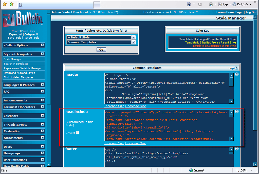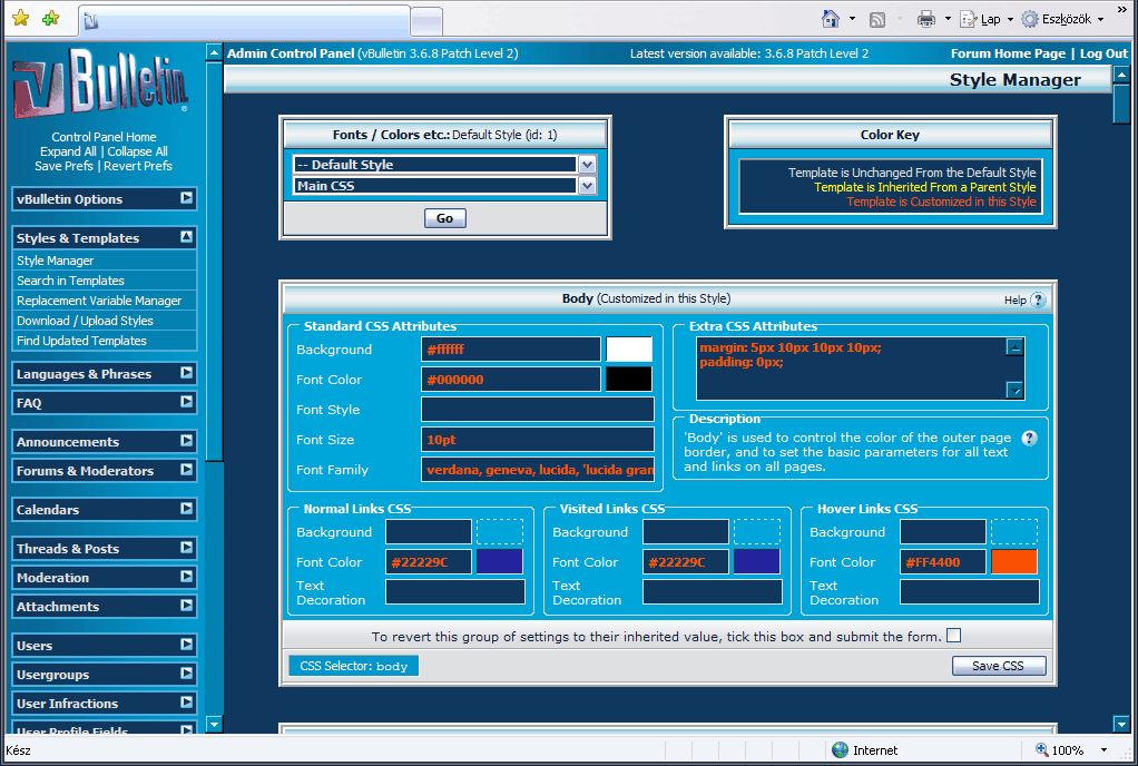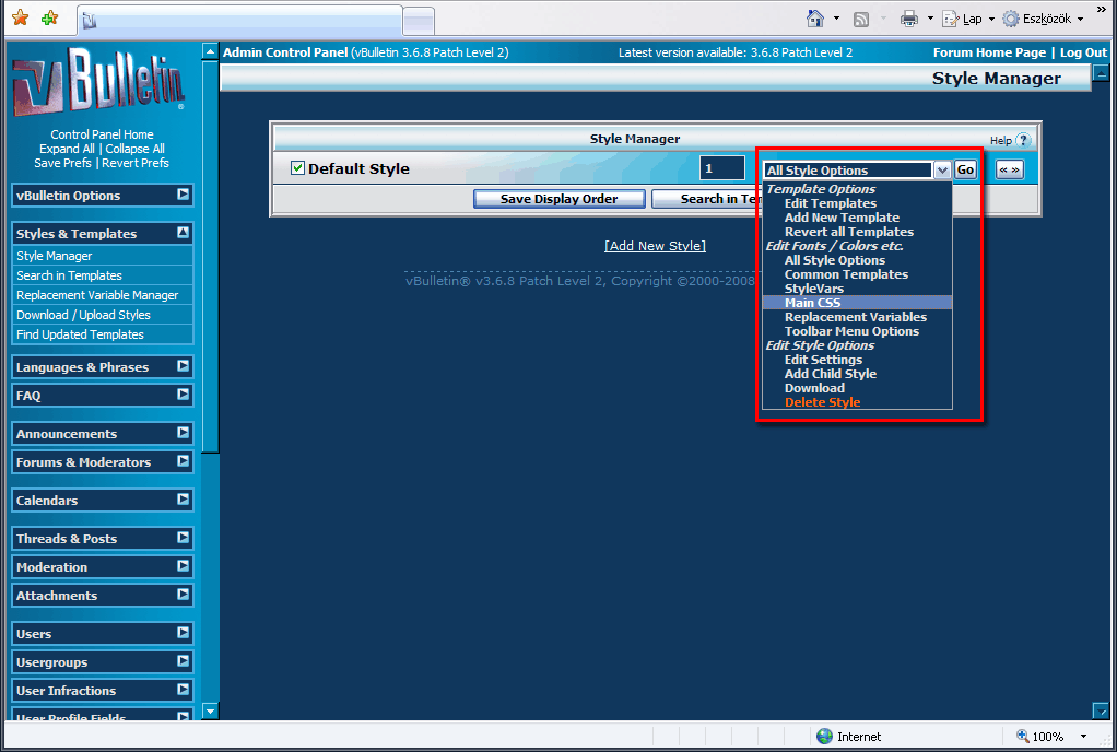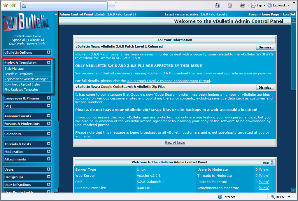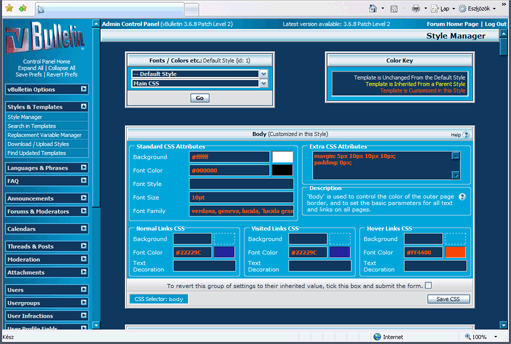 A vbulletin adminisztrációs felületére belépve a bal oldali menüben keresd meg a „Styles and templates” nevezetű részt. Itt érhetőek el a template fájlok illetve a CSS kód.
